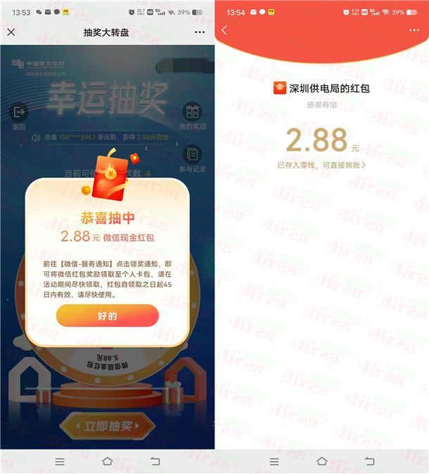 参加南网在线举办的“令人心动的服务”简单答问卷抽红包活动,通过打开微信进去活动里,里面有3个问卷都可以参加,每个问卷提交后都可以抽奖1次,合计可以抽3次,有机会中到2.88-188元微信红包,这个活动中了就是最低2.88元,非必中。