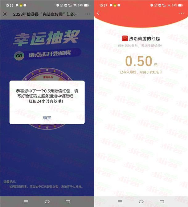 法治仙游和东丽司法2个活动抽0.5-2元微信红包 亲测中0.8元