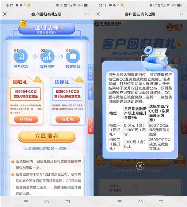 建行财富季回归礼的活动又来了,如果是回归的用户建议去参加,因为很粗暴给力,通过打开微信进去活动里,回归老用户报名参加(如果不能报名就说明参加不了),报名后完成资产达标可以领取到5元+35元微信立减金,合计可以领到40元,领到的微信立减金可以在微信支付的时候抵扣(也可以变现),如果不想领微信立减金也可以选择领4000个CC豆(领到的4000个CC豆也可以兑换40元京东卡)。
