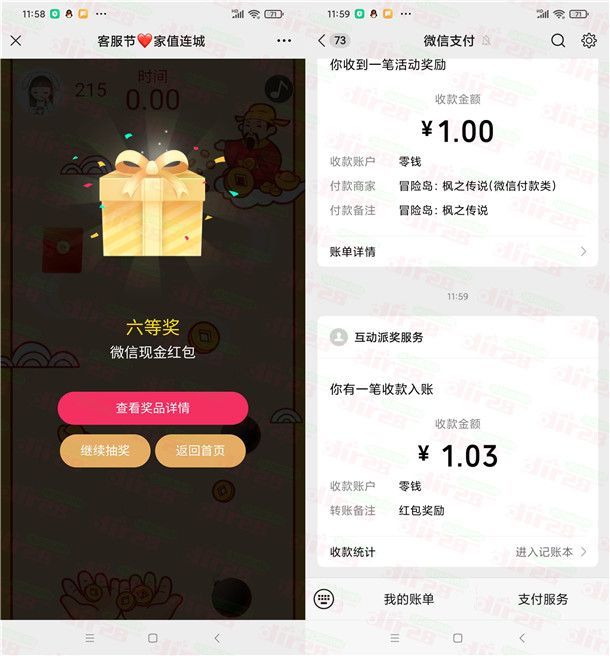 参加横琴人寿在线举办的财源滚滚接财神小游戏抽红包活动,通过打开微信进去活动里,小游戏中用手指控制手移动接下金币和元宝,只要小游戏分数达到80分就可以进行抽奖,每个微信每天可以抽3次,小编测试中到1.03元红包,非必中。