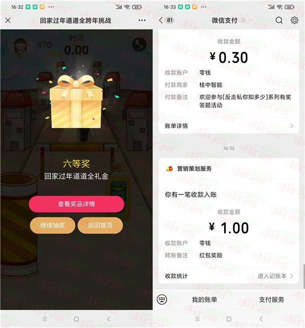 参加道道全举办的跨年大挑战游戏抽红包活动,通过打开微信进去活动里(需要关注微信公众号【道道全】才可以参加),小游戏分数达到300分就可以进行抽奖,每个微信每天可以抽奖3次,有机会中到随机金额的微信红包,小编测试中到1元秒推,非必中。