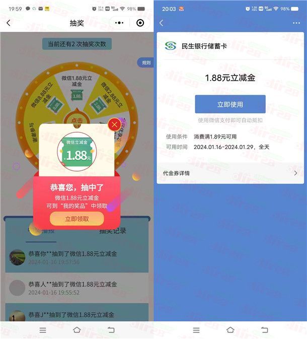 这个活动注册过民生银行二类电子卡、三类电子卡的都可以参加,通过打开微信进去小程序活动里,每个月5号之后都可以去,每个月都可以抽奖3次,有机会中到1.88-8.88元微信立减金,尽量有水的时候再抽,如果最近的抽奖记录显示有很多人中微信立减金,就说明有水,小编测试中到2个1.88元微信立减金,非必中。