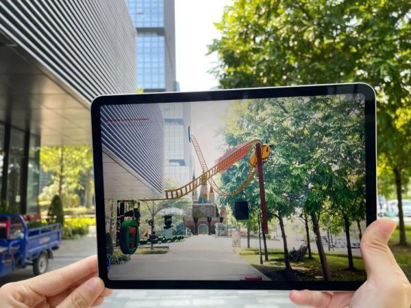 晨景科技利用空间智能和虚拟现实技术,将设计好的儿童游乐园叠加在公司办公楼的真实场景中。新华社记者马晓成 摄
