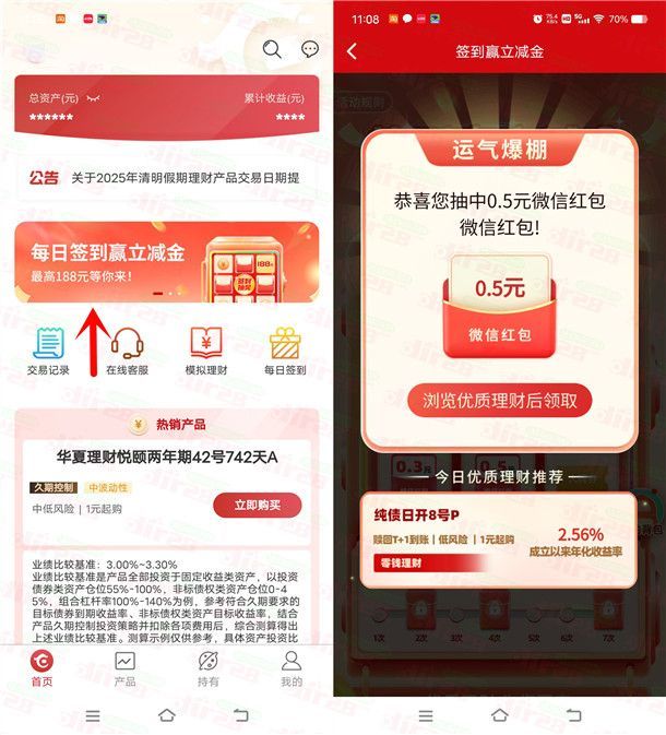 华夏理财每日签到抽0.3-188元微信红包 亲测中0.5元秒推