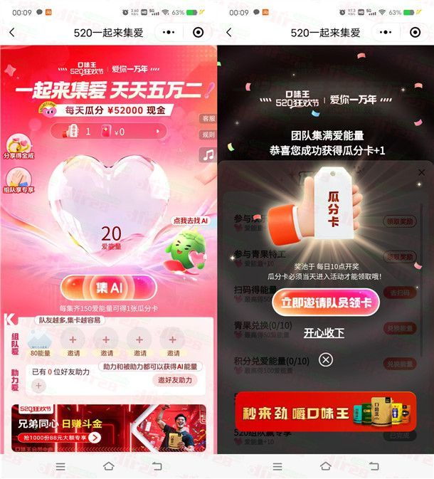 口味王520一起来集爱每天瓜分5.2万元微信红包 5月21日可提现