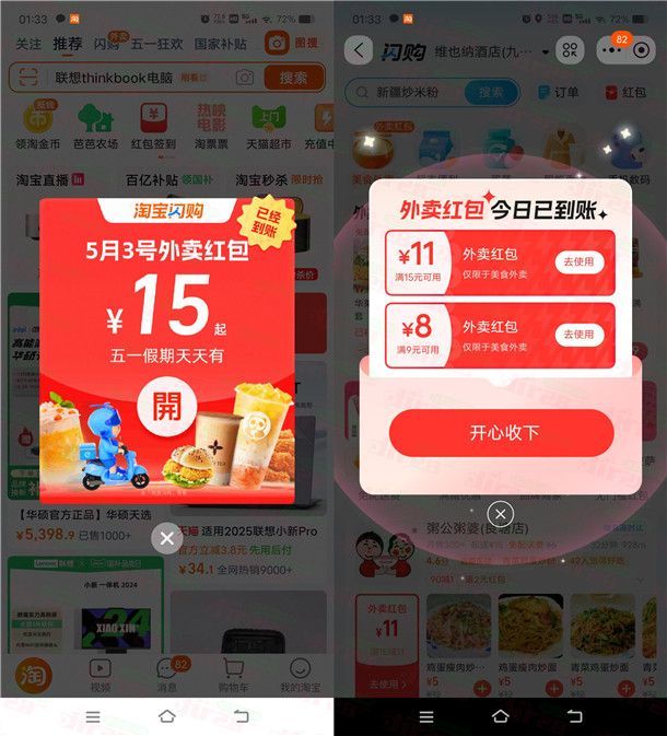 参加淘宝举办的五一假期天天有活动,通过打开“淘宝”APP,部分用户在首页会有弹窗或者点【闪购】进去看看有没有弹窗,我昨天弹窗领到一张满15减12元外卖红包,今天又送了一张满15减11元外卖红包,可以点饿了么外卖使用,如果没有弹窗可能就领不了。