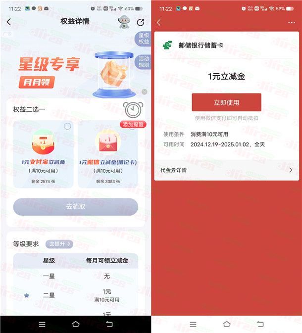 参加邮储银行举办的星级专享月月领活动,通过打开邮储银行APP进去权益专区页面,需要二星级才可以参加,如果不足二星级可以完成指定的任务达到二星级,二星级可以领到1元微信立减金、或者1元支付宝红包,最高可以领到6元微信立减金或者6元支付宝红包,领取后秒到账,每个月都可以领1次。