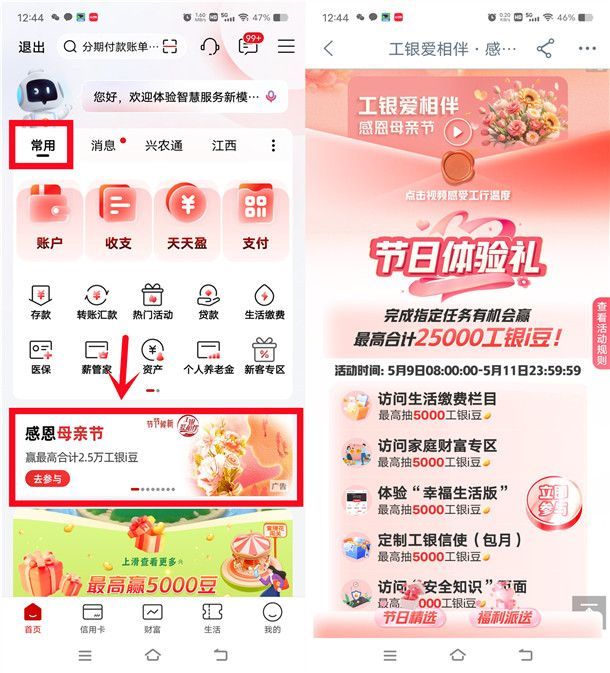 小编提示:打开最新版本“中国工商银行”APP,首页点【常用】栏目,再点中间滚动图【感恩母亲节】进去,完成4个简单的浏览任务可以抽奖4次,中到的i豆可以兑换京东卡、中石化加油卡等等,每1000个i豆=1元