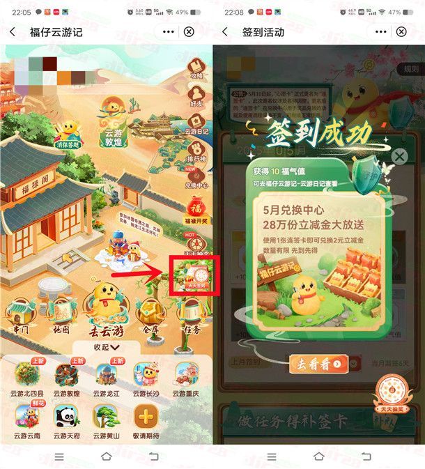 小编提示:打开“中国银行”APP搜索【福仔云游记】进去,点击右侧【天天签到】累计签到7天可以得到1张连签卡,可以用连签卡兑换2元微信立减金,下拉页面还可以领几张补签卡,实际只需要签到2-3天就行