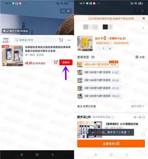 淘宝0元购买1大提悬挂抽纸包邮 简单领2个5元红包活动
