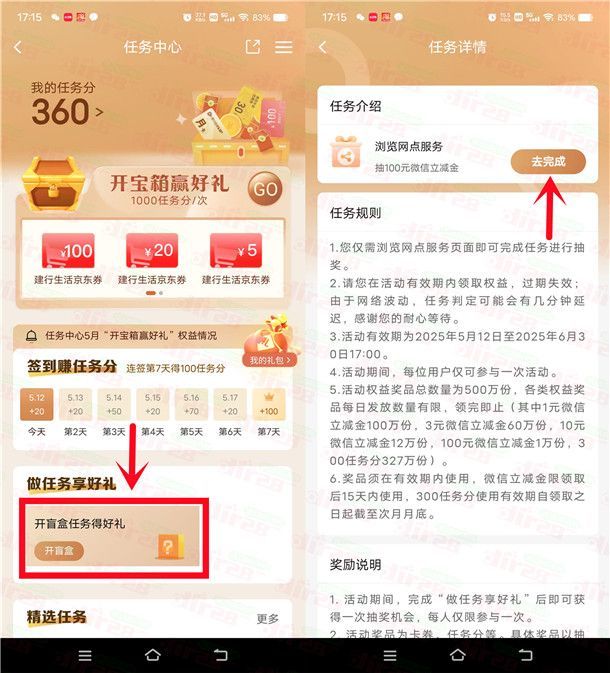 小编提示:打开“中国建设银行”APP,在【我的】页面点【任务中心】进去,如果有显示开盲盒任务就开启,完成一个简单的浏览任务抽,刚中3元,如果没有盲盒任务就参加不了,不是每个人都有活动入口