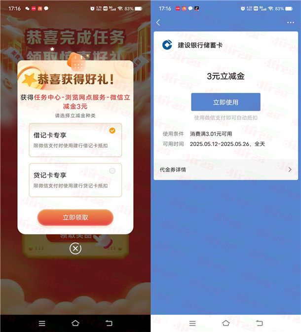 建行简单浏览网点开盲盒抽1-100元微信立减金 亲测中3元
