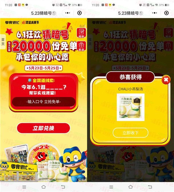 零食很忙小程序每天猜暗号抽2万份零食、饮料 可在门店领取