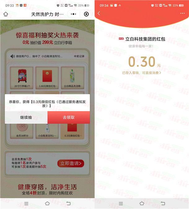 立白小程序2个活动抽0.3-1.68元微信红包 亲测中0.3元