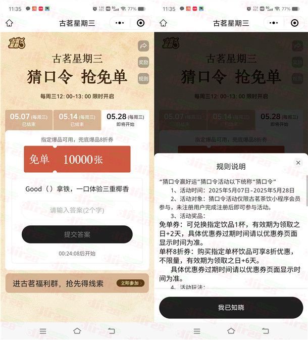 古茗微信小程序猜口令活动抢1万份奶茶免单 每周三12点整开始
