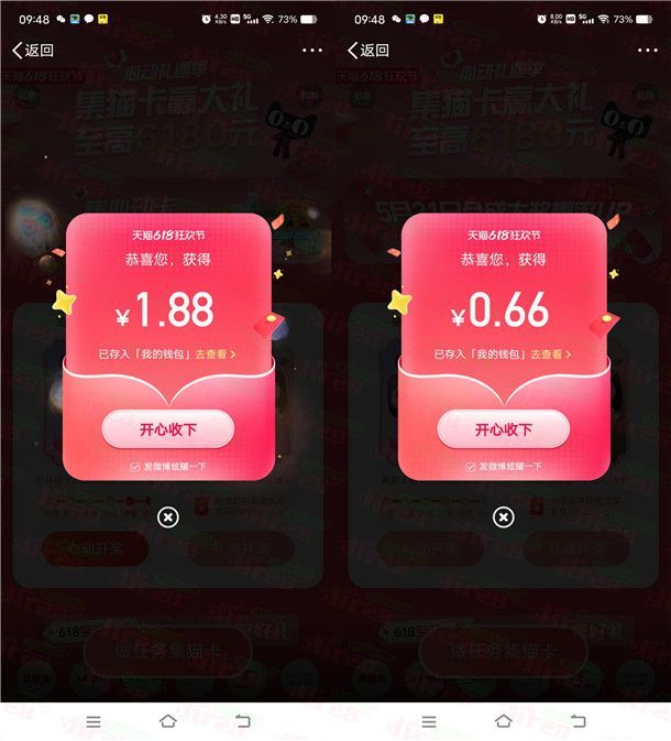 小编提示:打开“微博”APP扫描下面二维码点里面的链接参加,每天做简单的任务可以得心动卡、和礼遇卡,消耗卡片可以抽红包,心动卡抽奖金额随机、礼遇卡抽奖能中1.88元以上,可以中多次