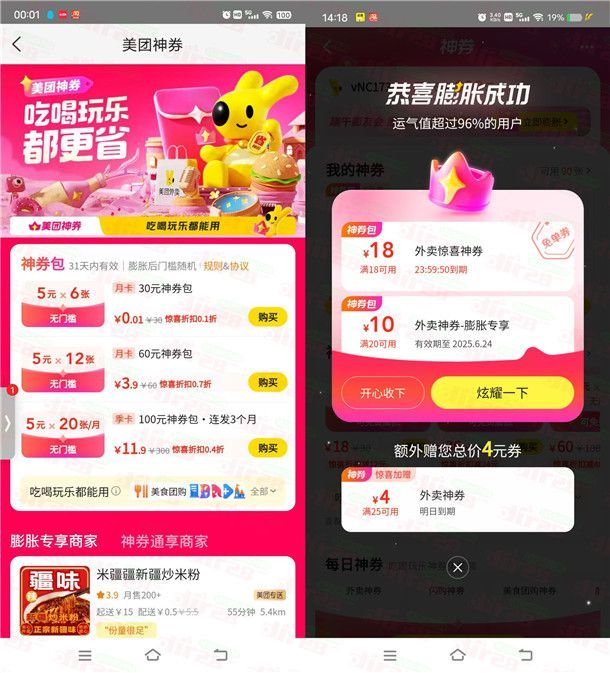 小编提示:打开“美团”APP搜索【神券天天领】进去,可以0.01元购买6张5元膨胀券,可以去“美团”APP首页点“外卖”进去再点底部“神券”进去膨胀,有概率膨胀到18元无门槛外卖券