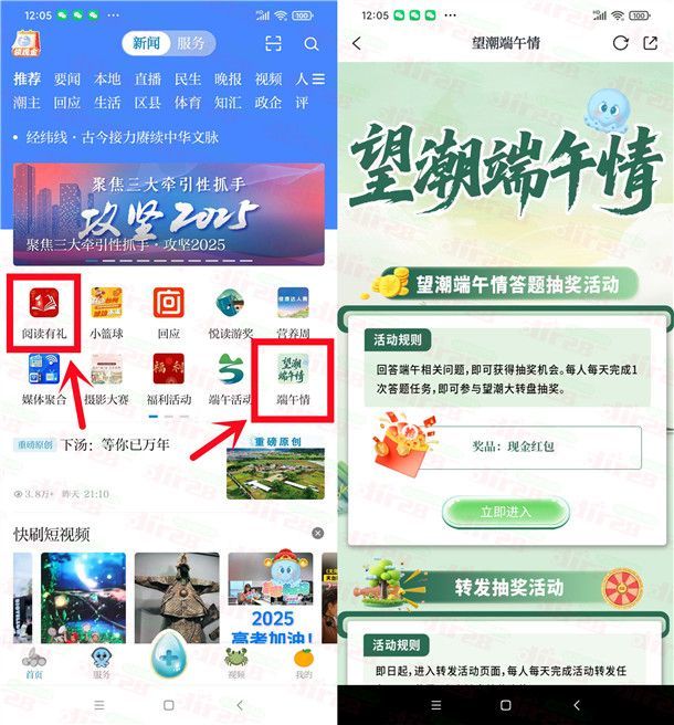 小编提示:打开“望潮”APP,首页点【端午情】和【阅读有礼】这2个活动都可以去,每天都可以抽,刚中0.38元,非必中