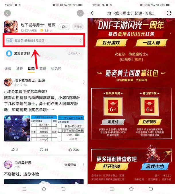 这是地下城与勇士虎牙直播渠道的一个回归活动,通过打开“虎牙直播”APP搜索【地下城与勇士】进去活动里,如果是回归老用户先绑定角色再下载游戏登陆一次,就可以回到活动里领取到6元红包(以6000个游戏金的形式到账),然后再去兑换2个3元微信红包,兑换后目前秒推,红包数量限量。