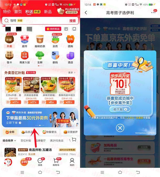 参加京东举办的高考搭子选伊利抽外卖券活动,通过打开最新版本“京东”APP,点顶部【秒送】再点中间滚动图【下单赢最高30元外卖券】进去,每天都可以抽,刚中满11减10元外卖券,可以叠加这段时间微信里领的满6减5元外卖券一起叠加抵扣,如果京东APP里没有活动入口就将京东APP更新到最新版本。