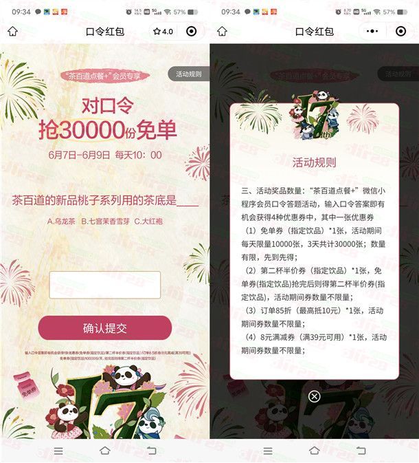 茶百道抢奶茶免单券的活动又来了,之前参加过的也可以去,通过打开微信进去茶百道小程序活动里,每天上午10点整开始,填写正确的口令就可以抢1万份奶茶免单券,抢到免单券后就可以免费喝一杯茶百道奶茶,喜欢喝奶茶的可以去抢,数量限量。