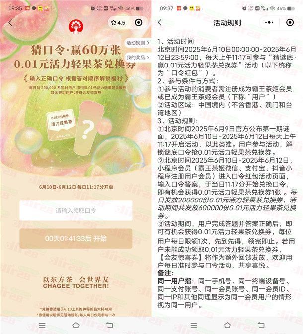 霸王茶姬猜口令抢免单的活动又来了,还是跟之前一样每天11:17分开始,通过打开微信进去小程序活动里,填写当天的口令参加,就可以抢活力轻果茶兑换券,抢到券后就可以0.01元喝一杯奶茶,每天20万份。
