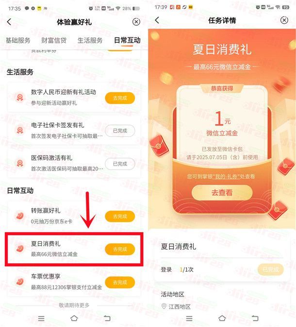 参加农行举办的月月抽好礼活动,通过打开中国农业银行APP搜索【体验赢好礼】进去,点【夏日消费礼】进去抽,有机会中到1-66元微信立减金,这个月没抽的可以去,每个月都可以抽1次,小编测试刚中1元,如果没有入口的就参加不了。