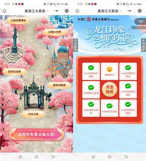 小编提示:复制下面文字入口到微信点开,进去点亮所有景点抽,每个人可以抽1次,中到的微信立减金全国所有地区工行卡都可以用,每天上午9点会补充库存
