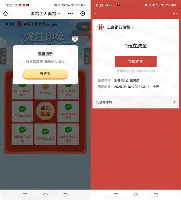 工行龙江印象小程序抽1-66元微信立减金 亲测中1元立减金