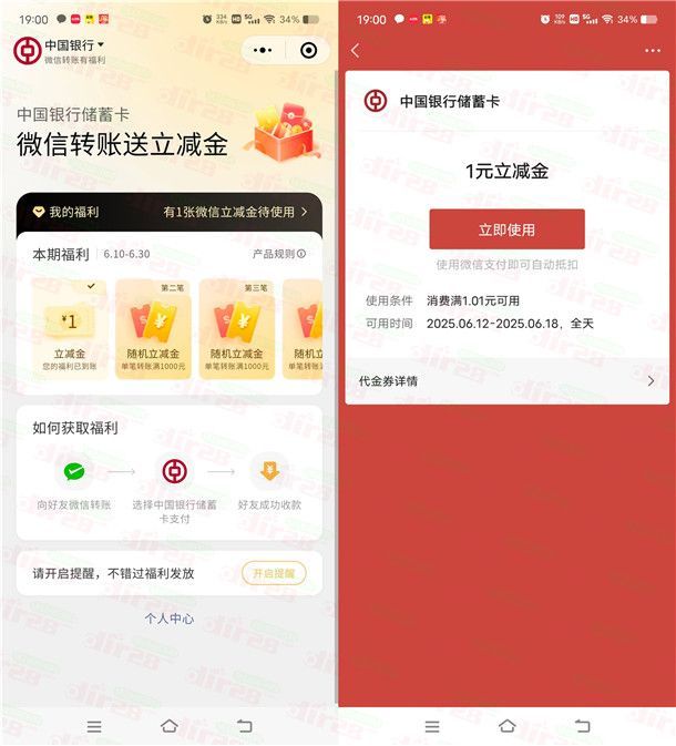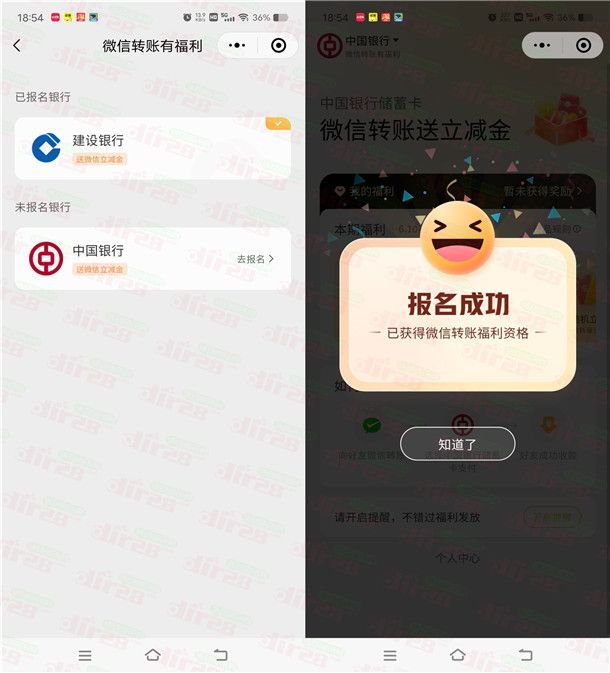 小编提示:微信扫描下面小程序码进去,有中国银行和建设银行,需要先报名,报名后在微信转账1000元给小号,支付方式选择中国银行,大号就会自动抽奖1次,刚中1元