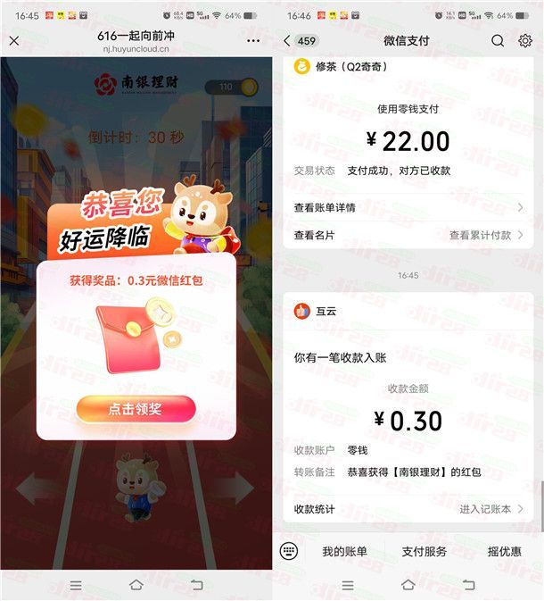 参加南银理财举办的616一起向前冲抽最高100元红包活动,通过打开微信进去活动里,小游戏点击小福鹿旁边左右按钮即可移动,在30秒内吃满100积分即可抽奖1次,每位用户可无门槛参与活动1次,做任务即可获得新的活动机会,有机会中到0.3-100元微信红包,小编测试中到0.3元红包秒推,非必中。
