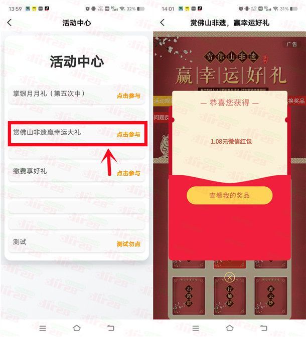 又来一个农业银行的活动,通过打开中国农业银行APP“进去赏佛山非遗赢幸运大礼”活动里,每支付1.11元可以抽1次,支付的钱会原路退回不会反撸,能参加的必中1.08-88.8元微信红包,刚中1.08元,全国都可以去,部分用户如果提示非受邀就参加不了。
