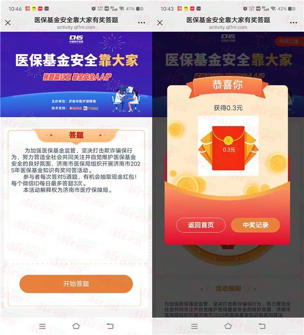 参加济南医保举办的医保基金安全靠大家有奖答题抽红包活动,通过打开微信进去活动里,参与者每次答对5道题,有机会抽取现金红包!每个微信ID每日最多答题3次,有机会中到随机金额的微信红包,小编测试中到0.3元,需要手动领取秒推,如果忘记手动领了就第二天再去中将记录里领。