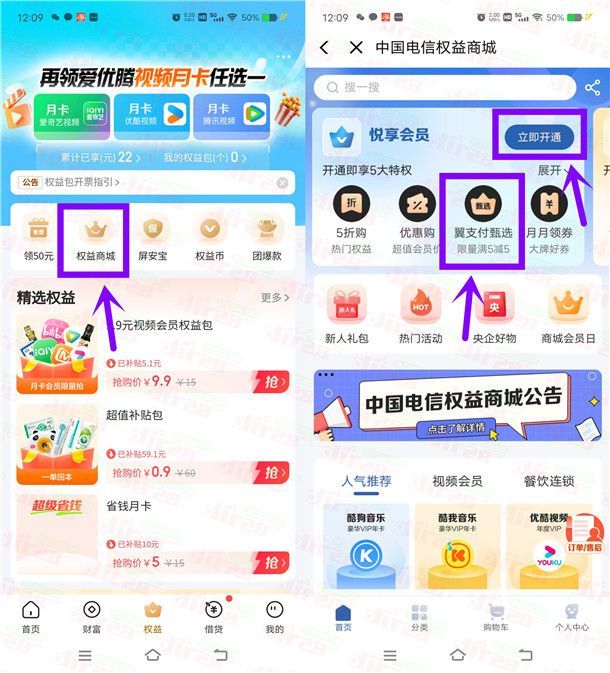 1、打开“翼支付”APP,点底部【权益】,再点【权益商城】进去,点立即开通可以0元领悦享会员(如果已经是会员就不用再领会员了)
