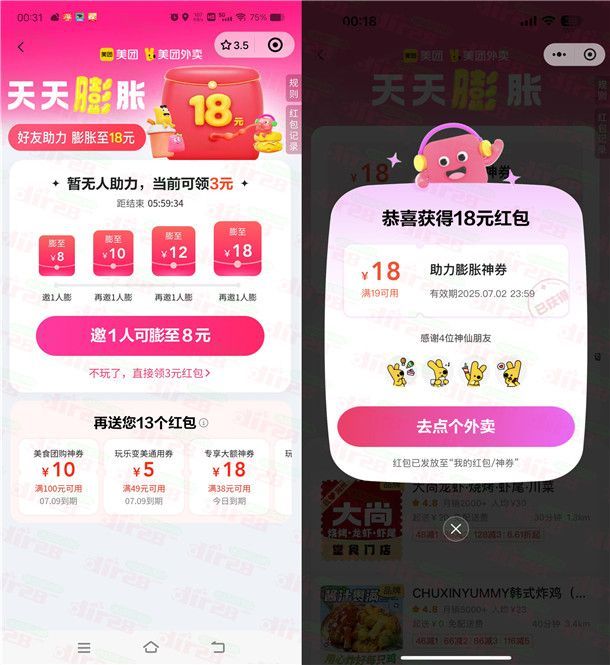 美团助力领外卖券的活动又来了,上次也有一次类似的活动,这是一个新的可以继续去参加,通过打开微信进去小程序活动里,进去邀请4个好友或者小号助力,大号就可以领到一张满19减18元美团外卖券,大部分店铺都可以用。