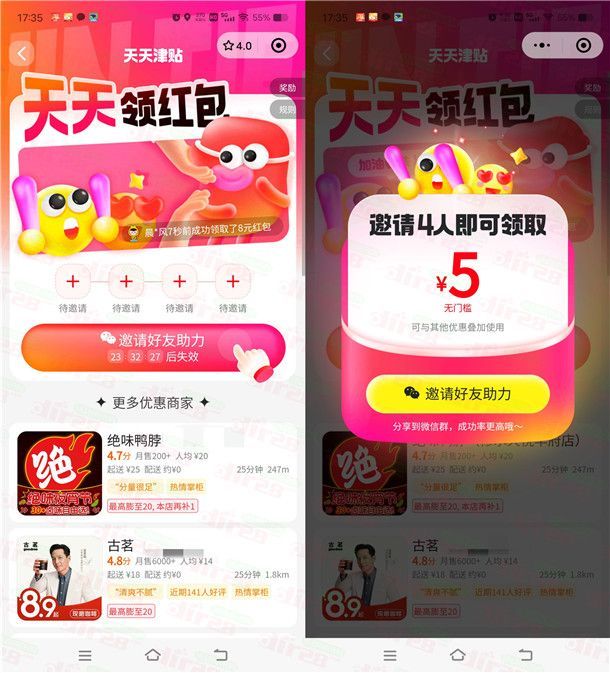 这是美团外卖的另外一个活动,通过打开微信进去美团小程序活动里,邀请4个好友或者小号助力,就可以领到一张5元津贴,可以叠加其他美团外卖券一起使用,需要点美团外卖的可以去参加,也可以跟另外一个美团邀请4个好友领18元外卖券的活动一起参加,因为可以叠加抵扣。