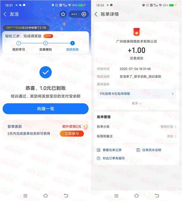 参加支付宝举办的友活来了简单答题领1元现金红包活动,通过打开支付宝APP进去活动里,首次答对5道模拟题就可以领取1元现金红包,得到的现金红包秒到支付宝余额里,很简单的一个活动。