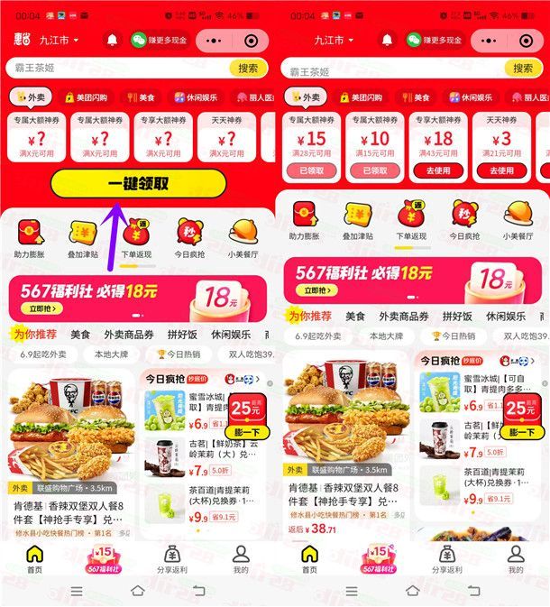 美团今天周六又开始送外卖券了,这是微信小程序端的一个活动,通过打开i微信进去小程序活动里,点击【一键领取】可以直接领到满15减10元外卖券、和满28减15元外卖券,很多店铺都可以使用,可以在美团点外卖抵扣使用。