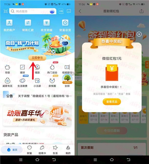 参加威海银行举办的夏日钱力计划抽红包活动,通过下载打开“威海银行”APP,首页点顶部“夏日钱力计划”进去,点夏日红包进去签到抽(签到第1天、第7天、第15天都可以抽1次),只要注册就行,不用实名也不用绑卡,小编测试刚中1元微信红包,只认红包,中到其他的没用,非必中。