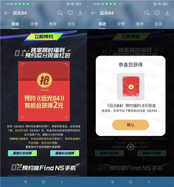 2、打开“oppo游戏中心”APP搜索【远光84】进去游戏下载页面点击活动进去,预约游戏领2元现金红包,手游上线后可以提现到支付宝
