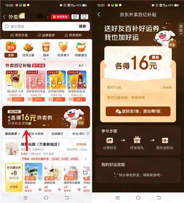 京东一个简单领16元外卖券的活动,通过打开京东APP进去活动页面点中间滚动图“各得16元外卖券”进去,分享给好友或者小号都可以,大小号都可以得到1张10元京东外卖券+满7减6元叠加券,点外卖可以直接减16元。