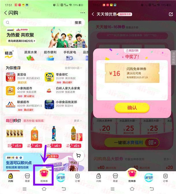 小编提示:打开“美团”APP,首页点【闪购】进去,再点底部中间【抢神券】进去抽奖,每天可以抽3次,非必中