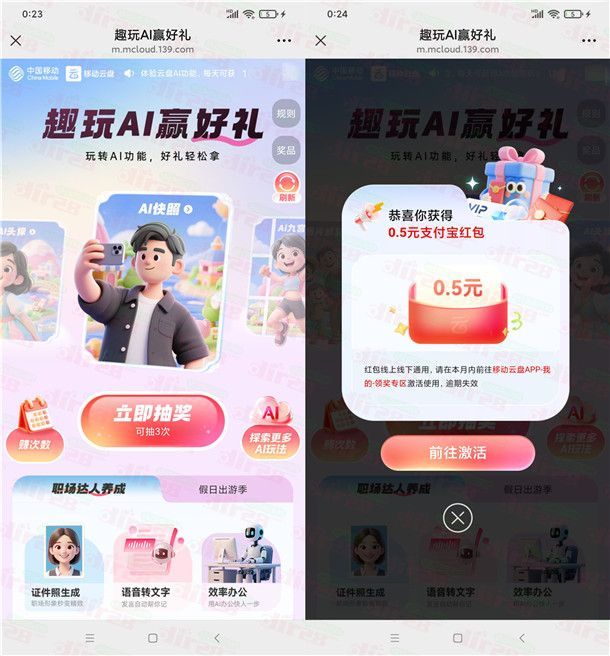 移动云盘趣玩AI赢好礼抽0.3-5元支付宝红包 亲测中0.5元