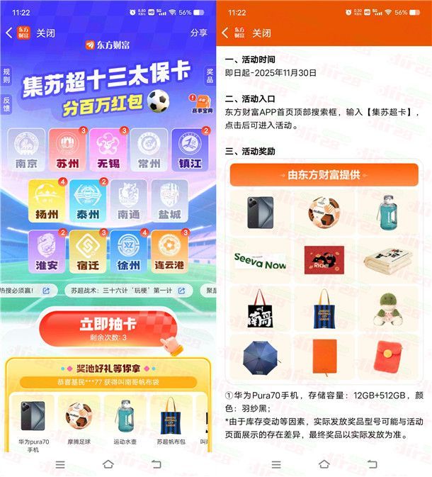 小编提示:打开“东方财富”APP搜索【集苏超卡】进去,每天多次机会集卡,集齐所有卡片瓜分百万现金红包、实物,如果是东方财富的黑号就别去,黑号是不中的