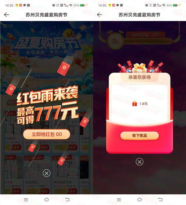 贝壳找房盛夏购房季抽最高777元现金红包 亲测中1.8元