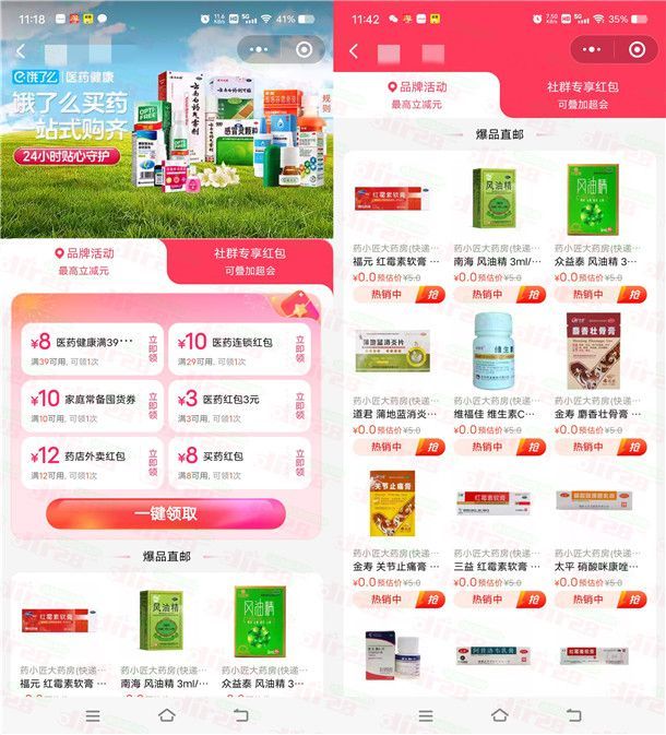这是饿了么的一个0.01元买药的活动,通过打开微信进去小程序活动里,进去一键领取券,可以领到3-10元无门槛券,领到券后下拉页面很多药品都是0.01元免配送费,数量限量。