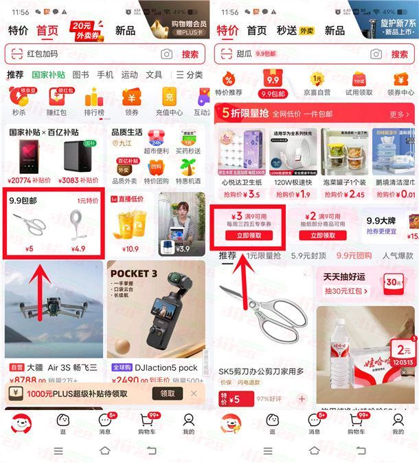 1、先打开“京东”APP,首页点【9.9包邮】进去,再领满9减3元券