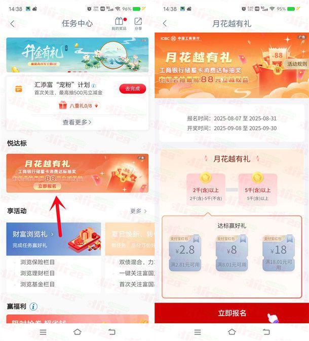 小编提示:打开“中国工商银行”APP搜索【任务中心】进去,点【月花越有礼】进去活动里报名(如果没有入口就参加不了),报名后在六大平台(支付宝、微信、美团、抖音、京东、拼多多)绑卡消费金额达到2000元抽2.8-18元支付宝红包、消费金额5000元抽2.8-88元支付宝红包