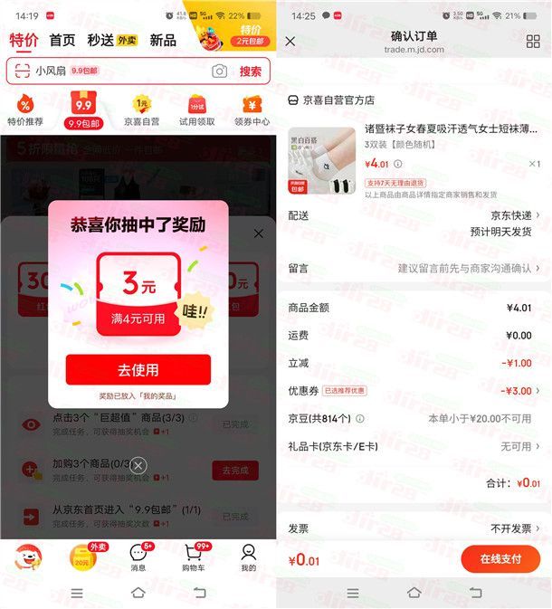 京东最低0.01元撸实物包邮 简单抽满4减3元优惠券
