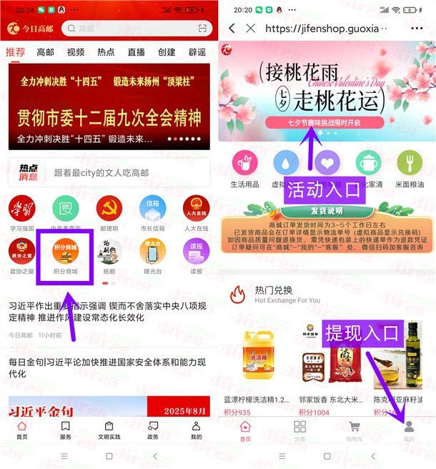 参加今日高邮举办的七夕接桃花雨走桃花运小游戏抽最高6.6元红包活动,通过下载打开“今日高邮”APP,首页点“积分商城”再点横幅“接桃花雨”进去,小游戏分数达到120分抽奖,每天都可以抽奖1次,有机会中到0.16-6.6元现金红包,小编测试刚中0.66元,中到红包在积分商城页面点右下角“我的”进去记录里提现到支付宝秒到。
